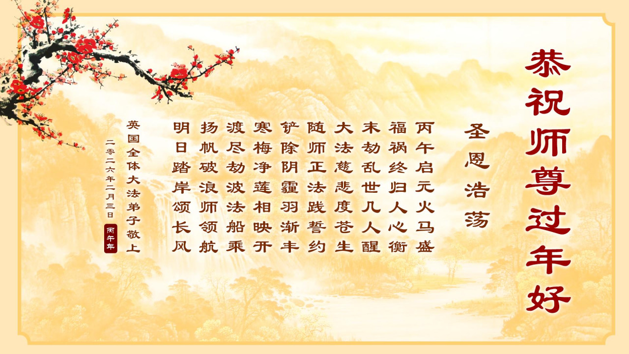 在师尊救度苍宇、法正洪穹的伟大正法中,丙午年到来了。值此天地归正,辞旧迎新之际,法国大法弟子在无限感恩中向慈悲伟大的师父拜年,恭祝师尊中国新年快乐! -